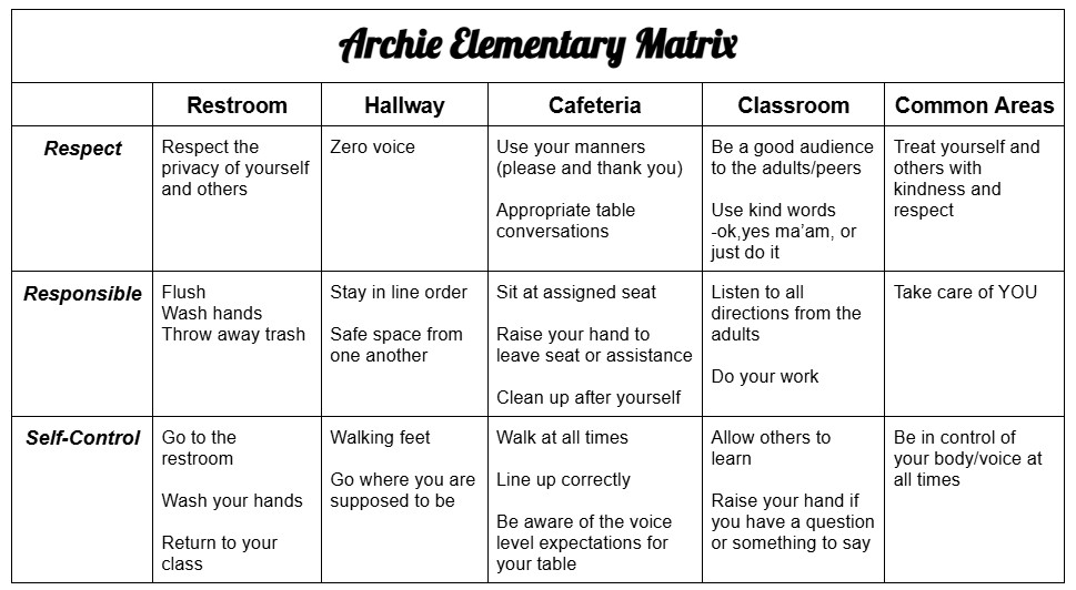 Archie R-V and the Regional Professional Development Center- Positive Behavior Support Team have been working together to create school-wide expectations that focus on respect, responsibility and self-control. These are three traits that can be used in all areas of our students' lives. |