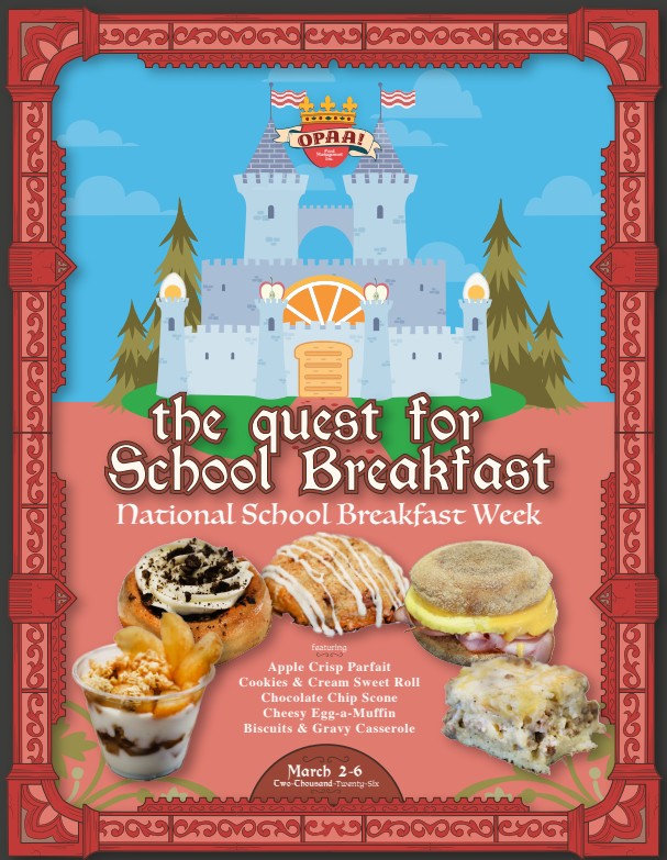 ⇒Update: The first week in March is National School Breakfast Week. OPAA! has a special breakfast menu for the week. This is a great time to try school breakfast! |
