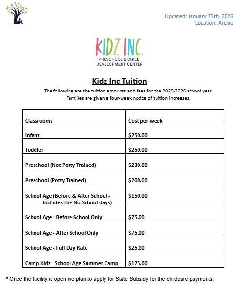 This partnership is designed to provide a safe, convenient childcare option for your child and family. We look forward to serving the Archie community! Scan Below or Click on This Link: KIDZ Inc. Enrollment |