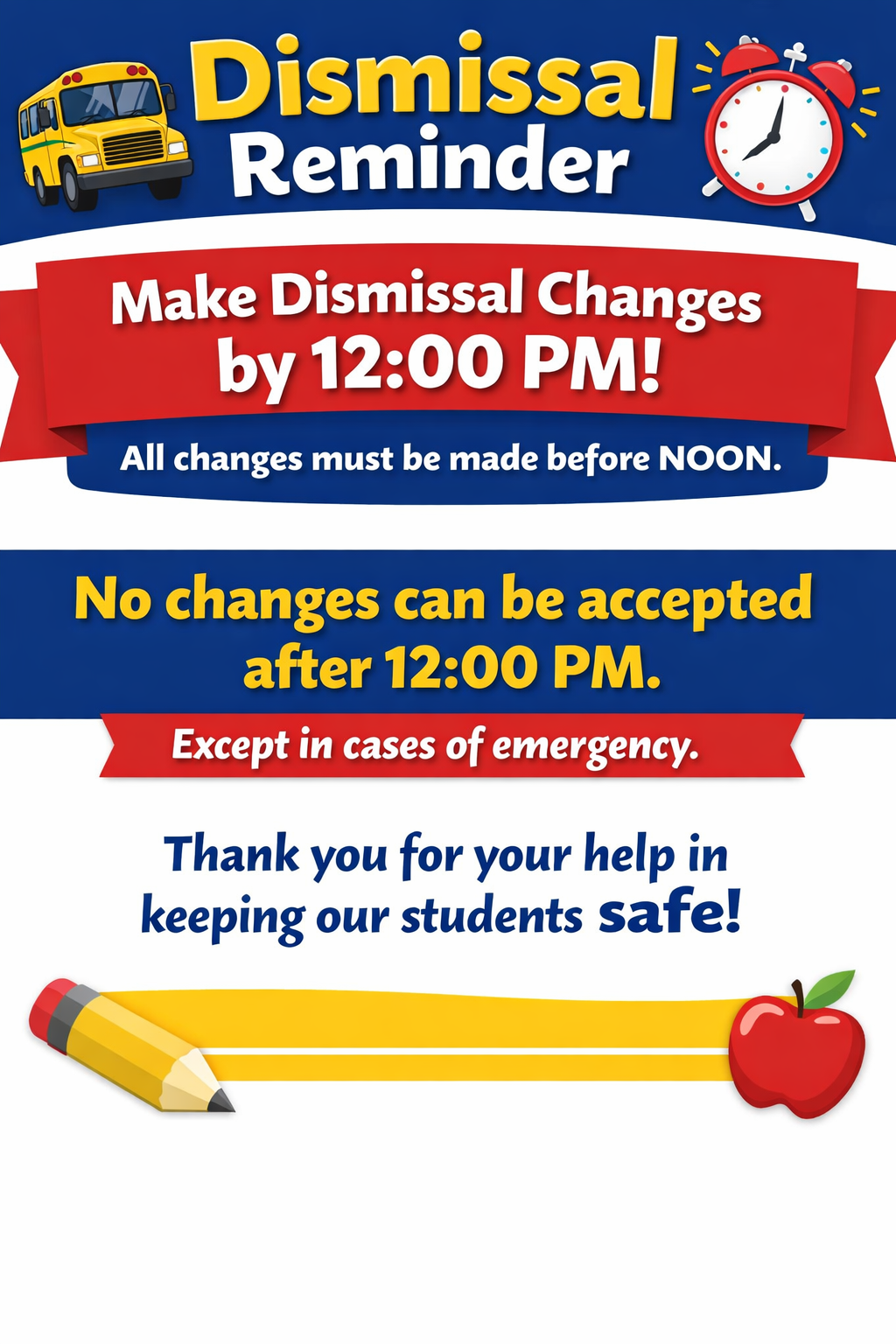 ⇐ Reminder: All dismissal changes must be made by 12:00 PM each day unless there is an emergency. To help ensure teachers receive the information in time and students are dismissed safely, please avoid calling after noon. Thank you for your cooperation and suppor